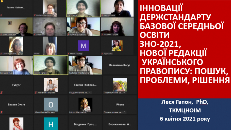 6 ківтня 2021 року відбувся вебінар для вчителів-словесників з теми "ІННОВАЦІЇ ДЕРЖСТАНДАРТУ БАЗОВОЇ СЕРЕДНЬОЇ ОСВІТИ ЗНО-2021,  НОВОЇ РЕДАКЦІЇ УКРАЇНСЬКОГО ПРАВОПИСУ: ПОШУК, ПРОБЛЕМИ, РІШЕННЯ". Спікер - Леся Гапон,PhD,ТКМЦНОІМ. Презентація - у вкладенні.