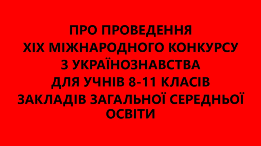 Відповідно до листа Міністерства освіти і науки України від 16.01.2026 р. №1/939-26 п. 8 додатка «Про організацію XIX Міжнародного конкурсу з українознавства для учнів 8-11 класів закладів загальної середньої освіти» та Правил проведення Міжнародного конкурсу з українознавства для учнів 8-11 класів загальноосвітніх навчальних закладів, затверджених наказом Міністерства освіти і науки України від 22.08.2013 № 1228, зареєстрованих в Міністерстві юстиції України 11.09.2013 за № 1567/24099, рішення Вченої ради НДІ українознавства КНУ імені Тараса Шевченка «Про проведення XIX Міжнародного конкурсу з українознавства для учнів 8-11 класів закладі загальної середньої освіти» (протокол № 10 від 27.11.2025), розпорядження НДІ українознавства КНУ імені Тараса Шевченка від 19.01.2026 № 2 «Про організацію XIX Міжнародного конкурсу з українознавства для учнів 8-11 класів закладів загальної середньої освіти» повідомляємо, що у 2025/2026 н.р. з